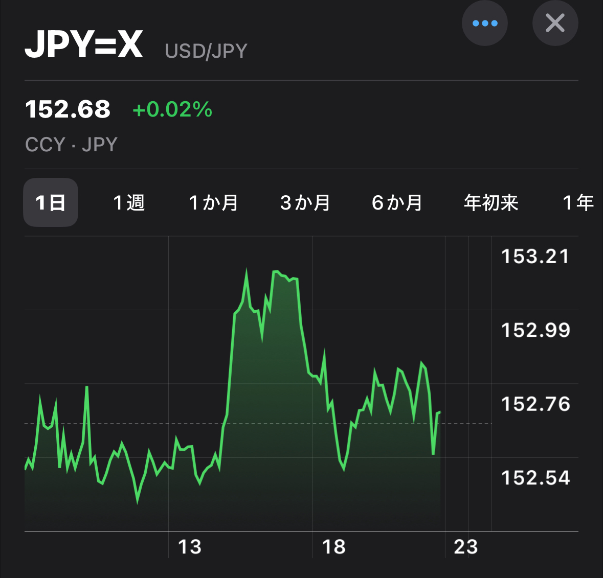 なんとこの時点で約1.3%もの上昇。そのままじわじわと円安が進み続け、現時点での円相場は1ドル152.81円になっています。【10/9(木)22時時点】